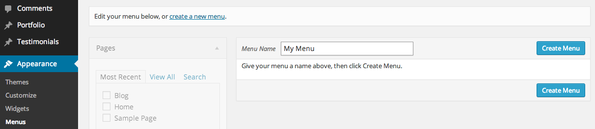 - Go to the 'Appearance / Menus' tab, enter a 'Menu Name' and press 'Create Menu'.