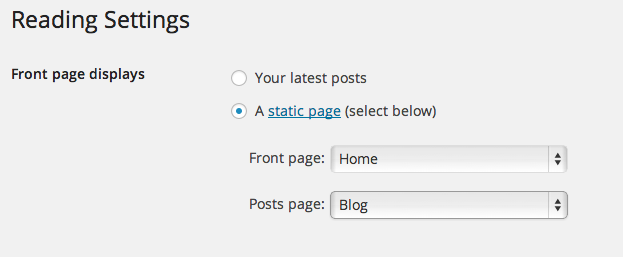 - Go to the 'Settings / Reading' menu and select a 'static page' at the 'Front page displays' setting. Choose your Homepage and Blog page there: